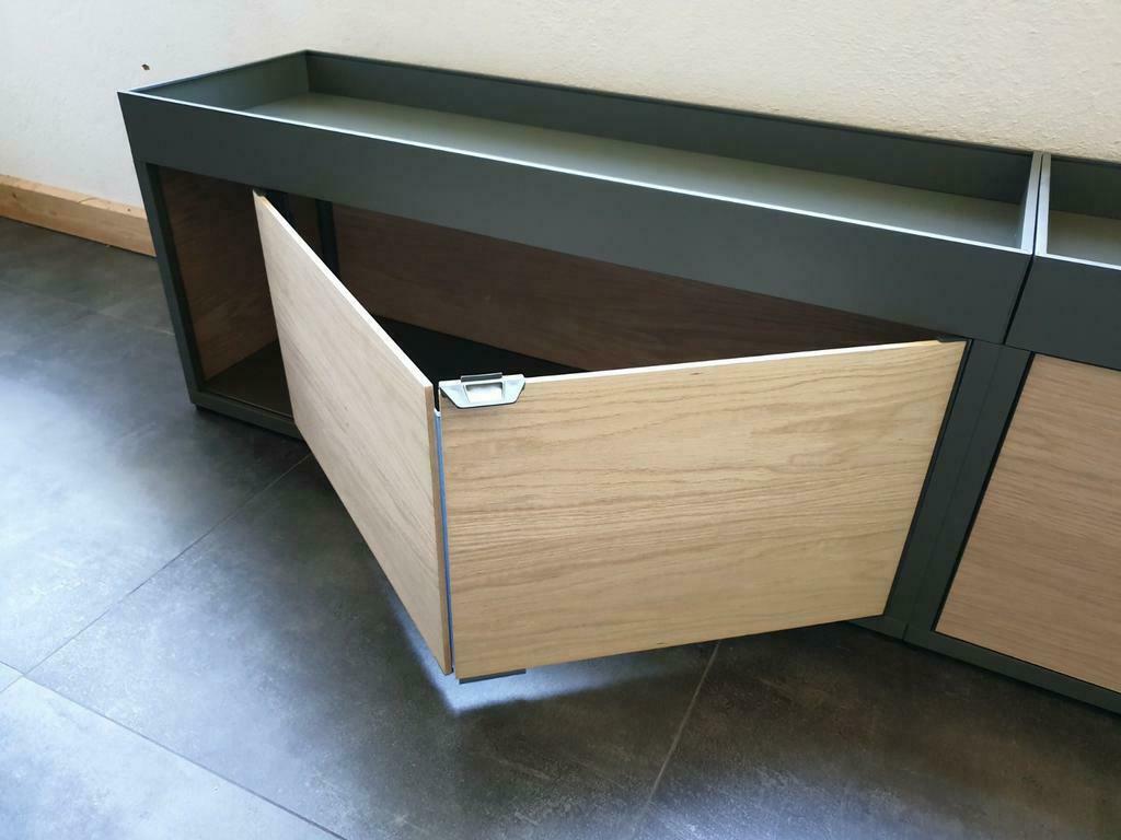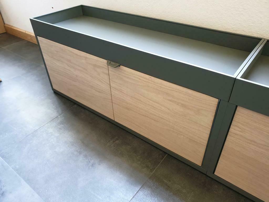 Hay new order design sideboard uitgevoerd in army green en blank eiken panelen. De kast is voorzien van 2 schuifdeuren aan de voorzijde.